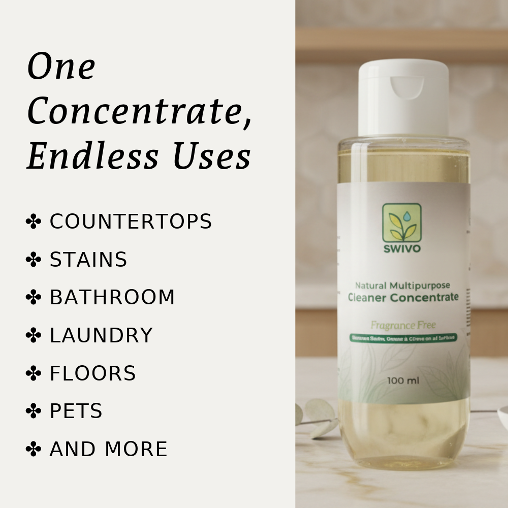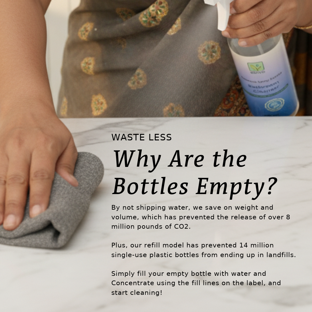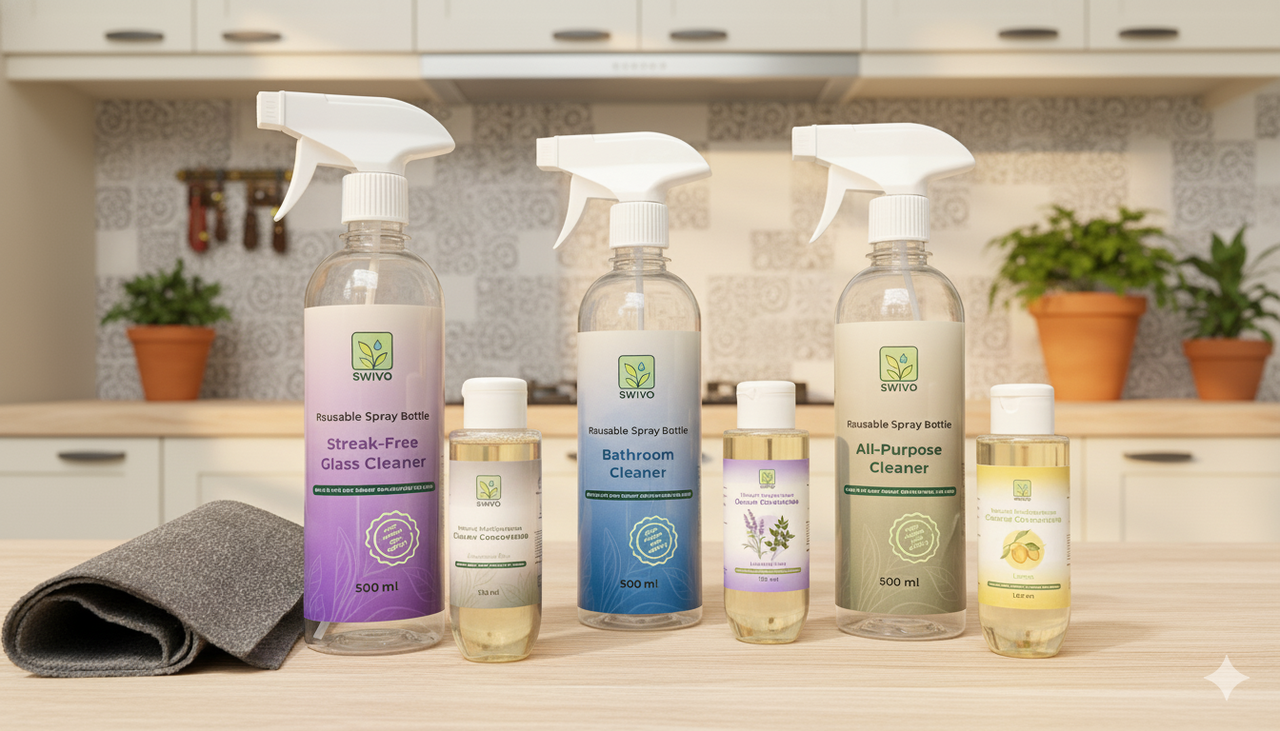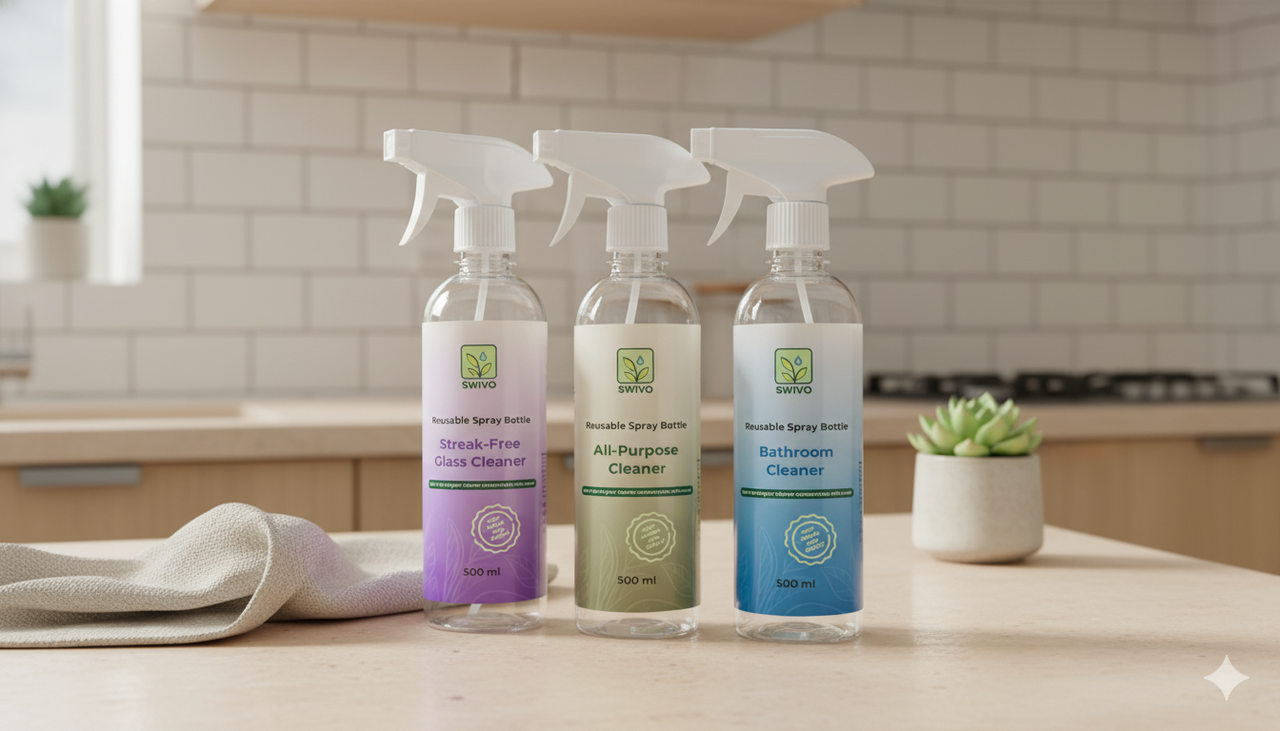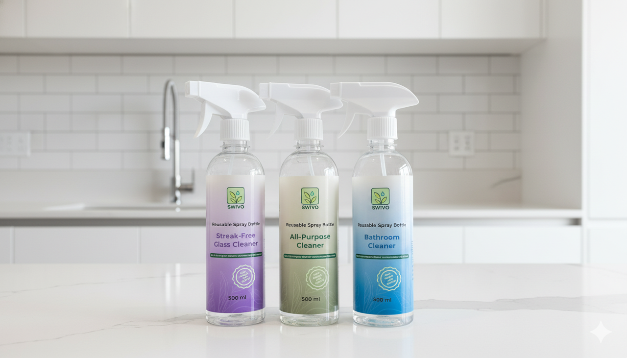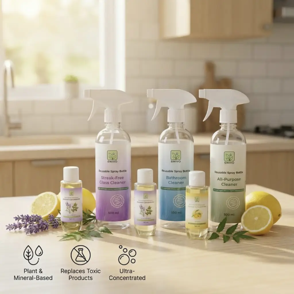 Everything you need to start immediately! 3 Concentrate Bottles (your choice of scent), 3 Refillable Spray Bottles (500ml each with clear labels for All-Purpose, Bathroom, and Streak-Free), 1 Precision Measuring Cup (with clear ml markings), and 1 Premium Cleaning Cloth (reusable microfiber). Just add water and you're ready to clean your entire home!